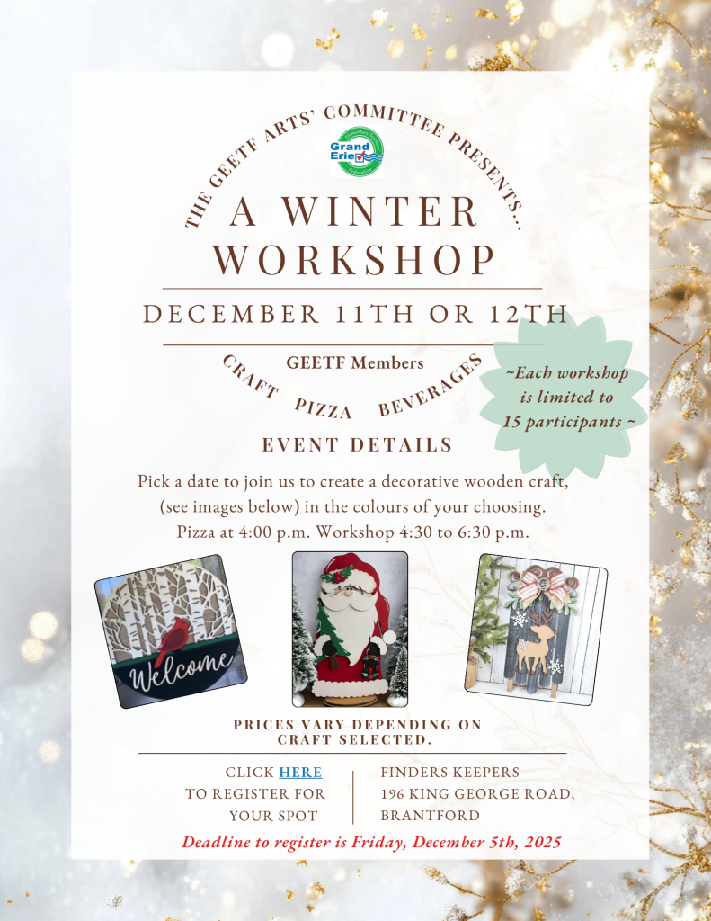FacebookTwitterGoogle+LinkedInPinterest Arts 'Winter Craft' Workshop159 Arts ‘Winter Craft’ Workshop by GEETF Arts Committee 317 people viewed this event. Geo Date And Time 2025-12-12 @ 04:30 PM to @ 06:30 PM Location 196 King Road, Brantford, ON Registration End Date 2025-12-05 Share With Friends Facebook Twitter Linkedin Xing Pinterest