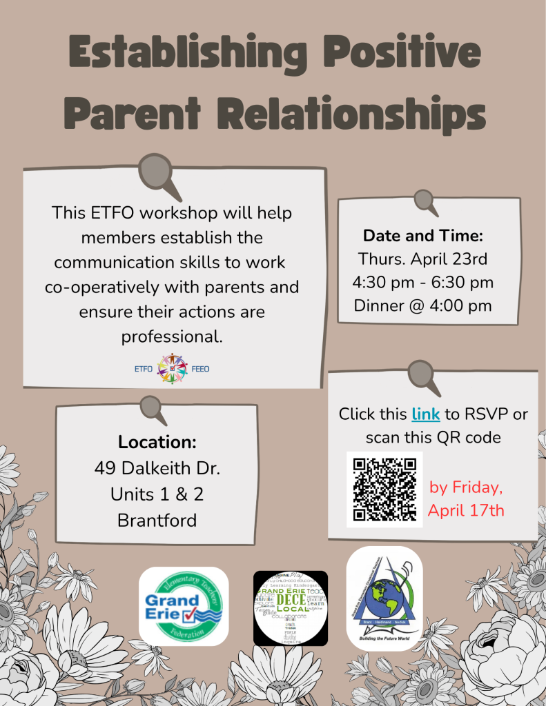 FacebookTwitterGoogle+LinkedInPinterest Cancelled - ETFO 'Establishing Positive Parent Relationships'28 Cancelled – ETFO ‘Establishing Positive Parent Relationships’ by ETFO Grand Erie TL, DECE, GEDSBOT 63 people viewed this event. Gr Date And Time 2026-04-23 @ 04:30 PM to Location GEETF Office 49 Dalkeith Drive, Units 1 and 2, Brantford, ON Registration End Date 2026-04-17 Share With Friends Facebook Twitter Linkedin Xing Pinterest