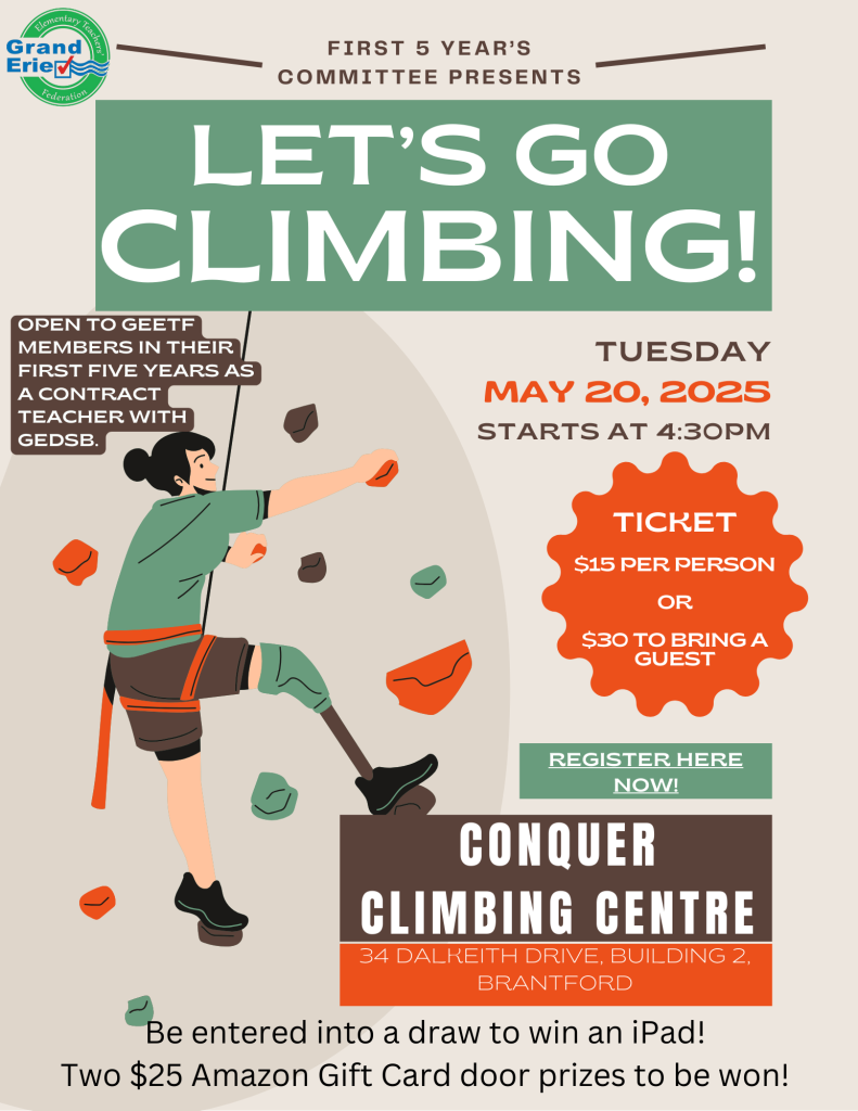 FacebookTwitterGoogle+LinkedInPinterest First 5 'Rock Climbing' Social170 First 5 ‘Rock Climbing’ Social by GEETF First Five Years Teachers' Committee 339 people viewed this event. Date And Time 2025-05-20 @ 04:30 PM to Location Conquer Climbing Centre, 34 Dalkeith Drive, Building 2, Brantford, ON Registration End Date 2025-05-09 Share With Friends Facebook Twitter Linkedin Xing Pinterest