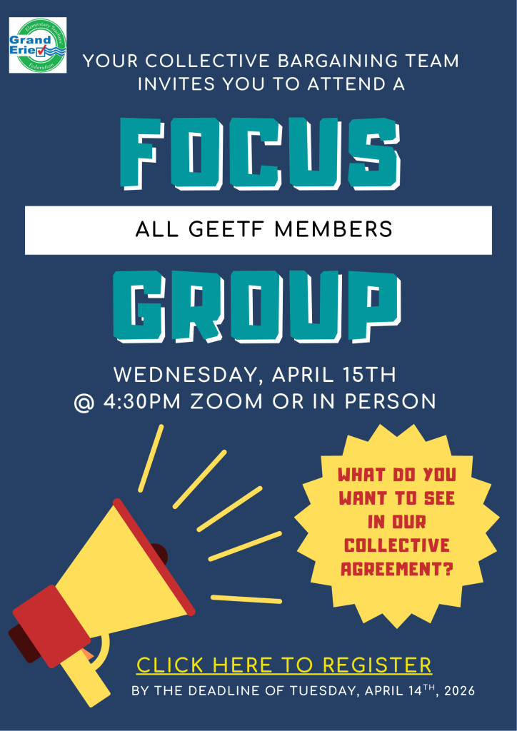 FacebookTwitterGoogle+LinkedInPinterest Focus Group - All GEETF Members48 Focus Group – All GEETF Members by GEETF Collective Bargaining Committee 99 people viewed this event. Date And Time 2026-04-15 @ 04:30 PM to Location GEETF Office, 49 Dalkeith Drive, Units 1 and 2, Brantford, ON Registration End Date 2026-04-14 Share With Friends Facebook Twitter Linkedin Xing Pinterest