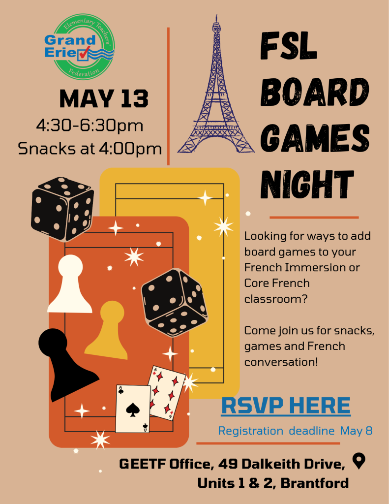 FacebookTwitterGoogle+LinkedInPinterest FSL Board Games Night76 FSL Board Games Night by GEETF French as a Second Language Committee 157 people viewed this event. To register for this event please visit the following URL: https://www.surveymonkey.com/r/FSLBoardGames → Date And Time 2026-05-13 @ 04:30 PM to Location GEETF Office, 49 Dalkeith Drive, Units 1 and 2, Brantford, ON Registration End Date 2026-05-08 Share With Friends Facebook Twitter Linkedin Xing Pinterest