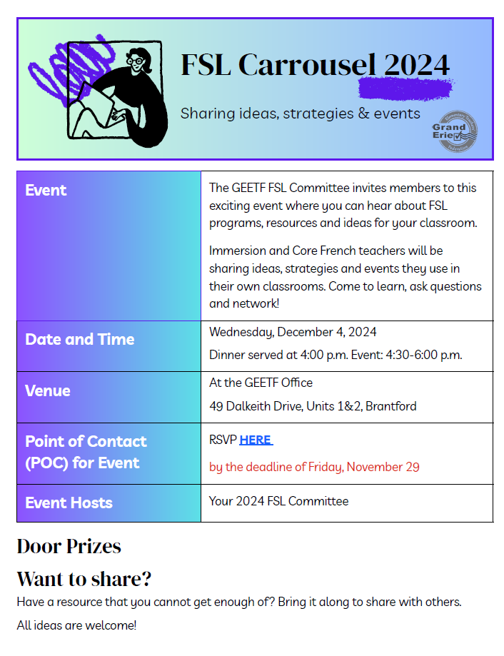 FacebookTwitterGoogle+LinkedInPinterest FSL Carrousel Event - CANCELLED - New date TBD189 FSL Carrousel Event – CANCELLED – New date TBD by GEETF French as a Second Language Committee (FSL) 380 people viewed this event. Date And Time 2024-12-04 @ 04:30 PM to @ 06:00 PM Location 49 Dalkeith Drive, Units 1 and 2, GEETF Office, 49 Dalkeith Drive, Units 1 and 2, Brantford, ON Registration End Date 2024-11-29 Share With Friends Facebook Twitter Linkedin Xing Pinterest
