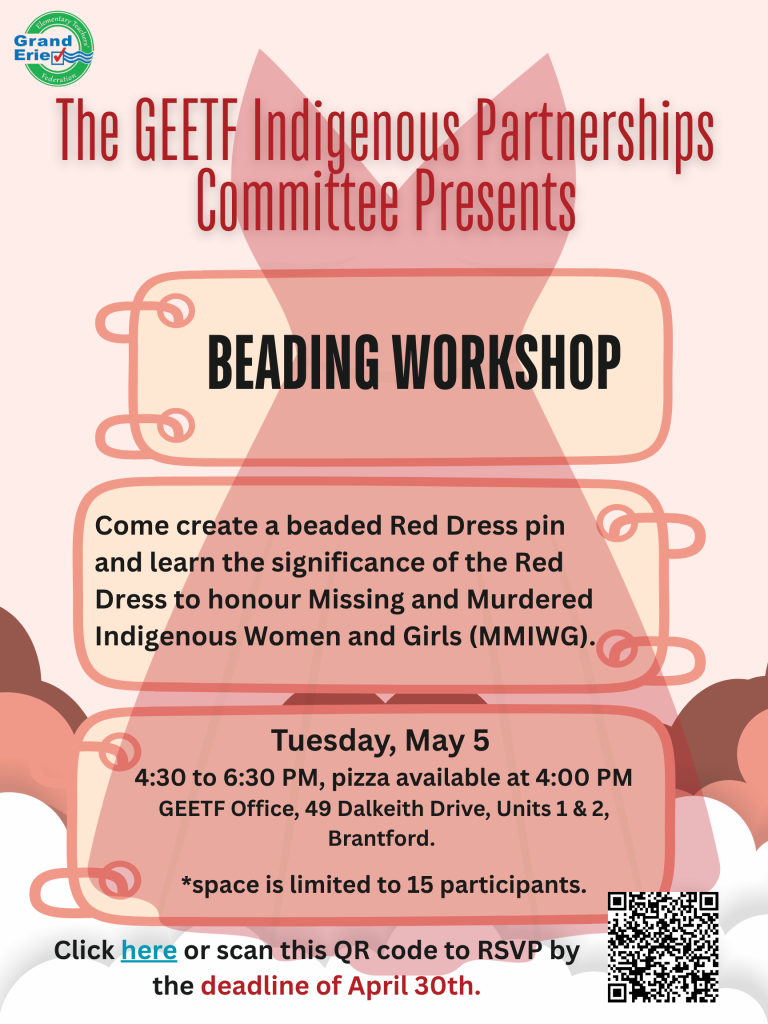 FacebookTwitterGoogle+LinkedInPinterest IPC 'Beading Workshop'10 IPC ‘Beading Workshop’ by GEETF Indigenous Partnerships Committee 19 people viewed this event. To register for this event please visit the following URL: https://www.surveymonkey.com/r/RedDressPin → Date And Time 2026-05-05 @ 04:30 PM to @ 06:30 PM Location GEETF Office 49 Dalkeith Drive, Units 1 and 2, Brantford, ON Registration End Date 2026-04-30 Share With Friends Facebook Twitter Linkedin Xing Pinterest