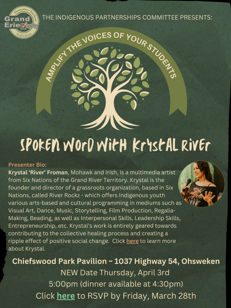 FacebookTwitterGoogle+LinkedInPinterest New Date - Spoken Word with Krystal River175 New Date – Spoken Word with Krystal River by GEETF Indigenous Partnerships Committee 349 people viewed this event. Date And Time 2025-04-03 @ 04:30 PM to Location Chiefswood Park Pavilion, 1037 Highway 54, Ohsweken Registration End Date 2025-03-28 Share With Friends Facebook Twitter Linkedin Xing Pinterest