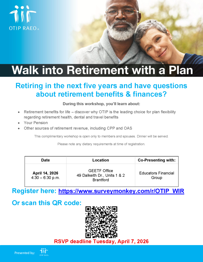 FacebookTwitterGoogle+LinkedInPinterest OTIP 'Walk into Retirement with a Plan'183 OTIP ‘Walk into Retirement with a Plan’ by OTIP and Educators Financial Group 365 people viewed this event. Date And Time 2026-04-14 @ 04:30 PM to @ 06:30 PM Location GEETF Office, 49 Dalkeith Drive, Units 1 and 2, Brantford, ON Registration End Date 2026-04-07 Share With Friends Facebook Twitter Linkedin Xing Pinterest