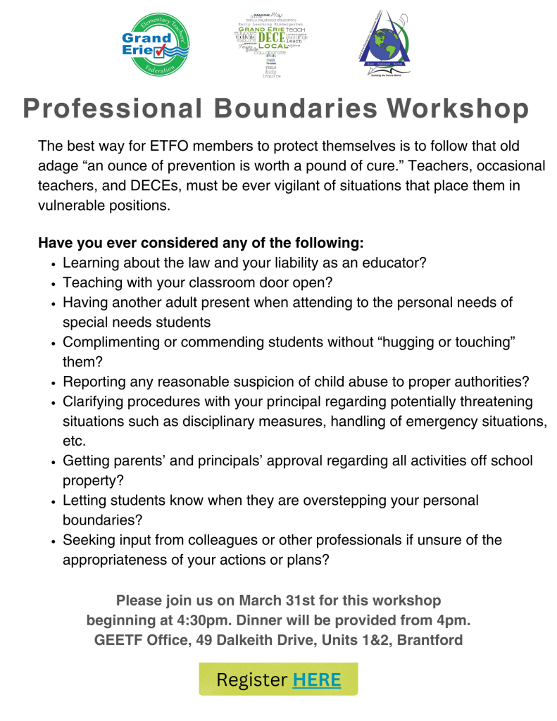 FacebookTwitterGoogle+LinkedInPinterest Professional Boundaries Workshop179 Professional Boundaries Workshop by Grand Erie Elementary Teachers' Federation, Grand Erie Elementary Occasional Teacher Local, Grand Erie DECE Local 361 people viewed this event. Date And Time 2025-03-31 @ 04:30 PM to Location 49 Dalkeith Drive, Units 1 and 2, GEETF Office, 49 Dalkeith Drive, Units 1 & 2, Brantford, ON Registration End Date 2025-03-28 Share With Friends Facebook Twitter Linkedin Xing Pinterest