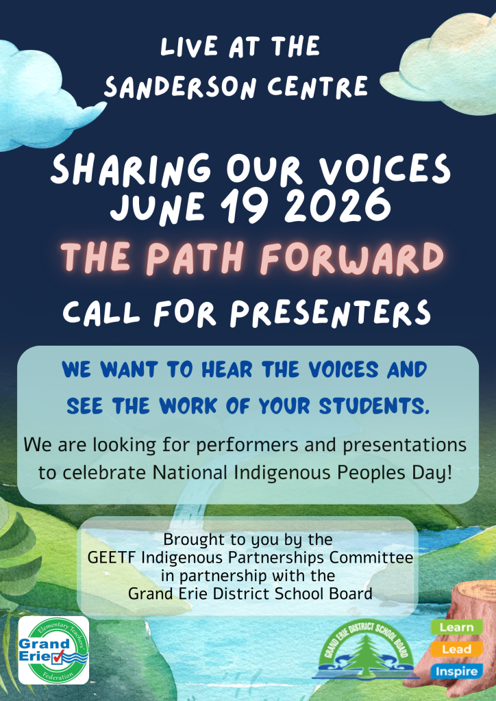 FacebookTwitterGoogle+LinkedInPinterest Sharing Our Voices: The Path Forward31 Sharing Our Voices: The Path Forward by GEETF Indigenous Partnerships Committee in partnership with the Grand Erie District School Board 63 people viewed this event. Click on the flyer for more information. To register for this event please visit the following URL: https://www.surveymonkey.com/r/SOV_School_RSVP → Date And Time 2026-06-19 @ 11:30 AM to @ 01:00 PM Location Sanderson Centre for Performing Arts 88 Dalhousie St, Brantford, ON Registration End Date 2026-05-15 Share With Friends Facebook Twitter Linkedin Xing Pinterest